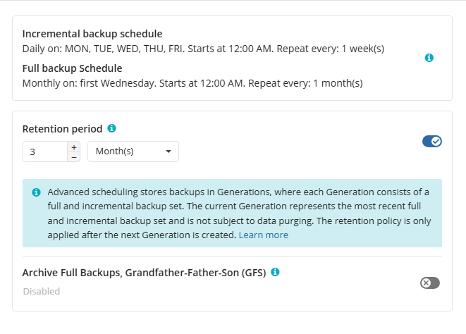Select the Advanced option to set up a flexible, recurring schedule with generations. Every generation contains one full backup followed by incrementals.