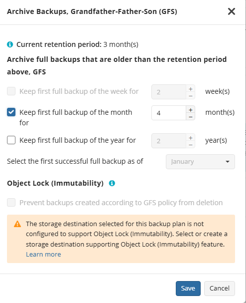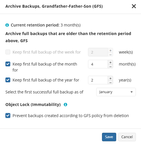 Object Lock (Immutability) is linked to the GFS retention policy. If the Object Lock (Immutability) is applied along with GFS settings, full backups that are subject to the GFS retention policy become immutable for the GFS keeping period.