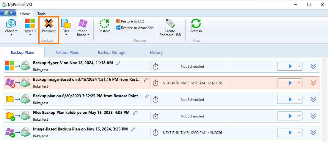 To create a new Proxmox backup plan, click the Proxmox in the horizontal menu bar.