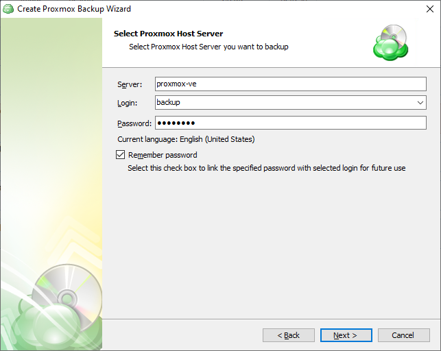 Enter Proxmox Host Server access information. You can select whether to remember the password for future use.