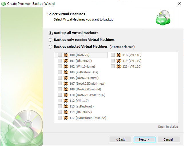 The Backup Agent provides the following options for selecting VMs within a Proxmox host: