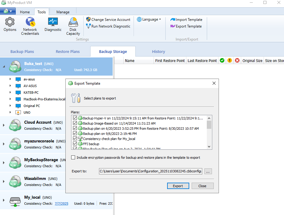 - Select Include encryption passwords for backup and restore plans in the template to export if some of plans have encryption.