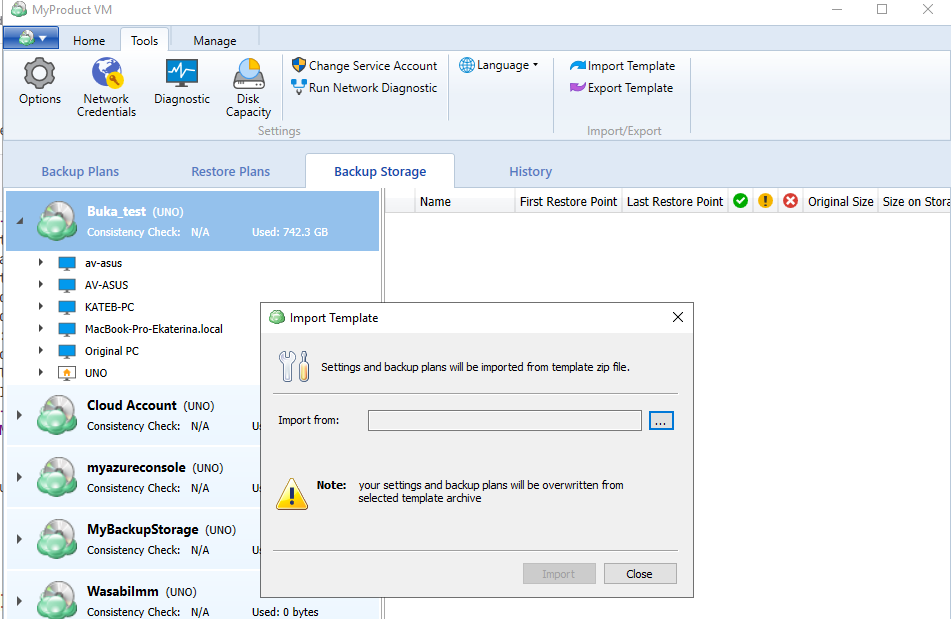 Launch Managed Backup Agent instance where you want to apply exported template. Check whenther all used cloud backup storage are added to this backup agent instance. Add the cloud backup storages in case of these backup storages are missed in this new backup agent instance.