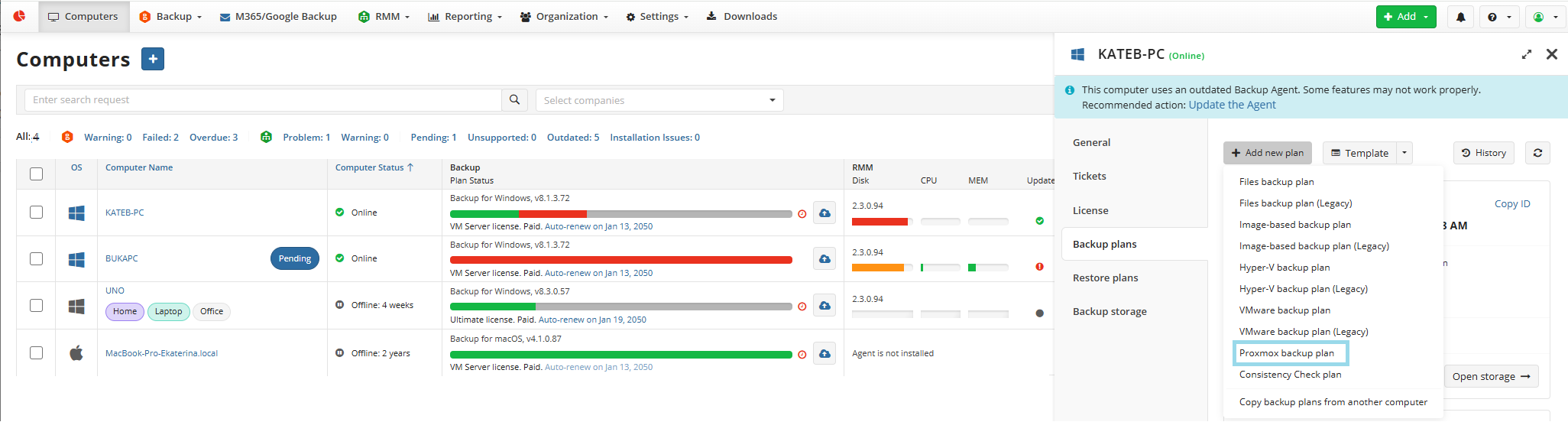 - To create a new Proxmox Backup Plan, click on “Add New Plan” then click on Proxmox backup plan