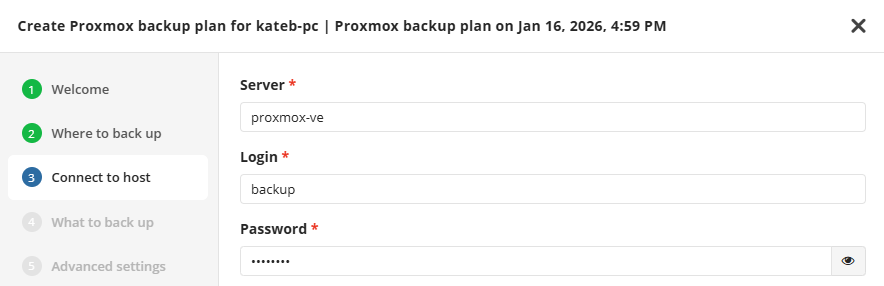 In case credentials are invalid or the Proxmox host server cannot be accessed, you will not be able to proceed to the next Backup Wizard step