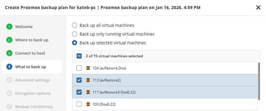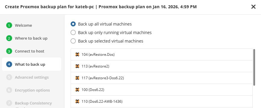 - Back up only running virtual machines: Only backs up VMs currently in “Running” status.