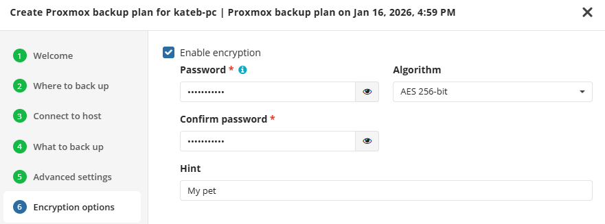 If you choose to save your backup plan configuration to the destination storage, be aware that the encryption password is not stored in the configuration file for security reasons. Ensure that you save this password securely, as it will be required to restore the backup's contents.