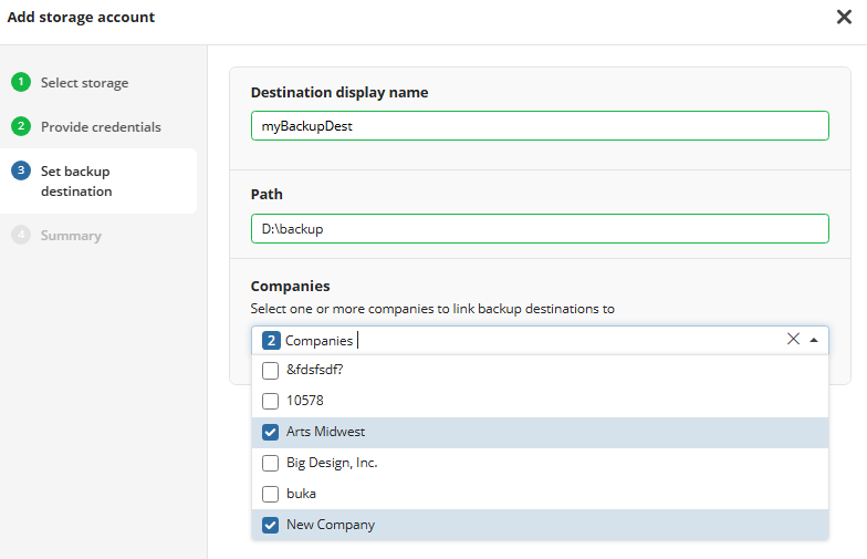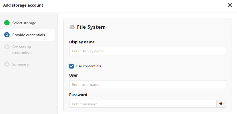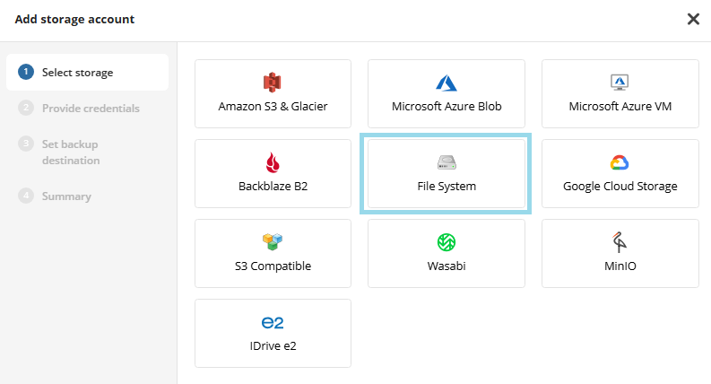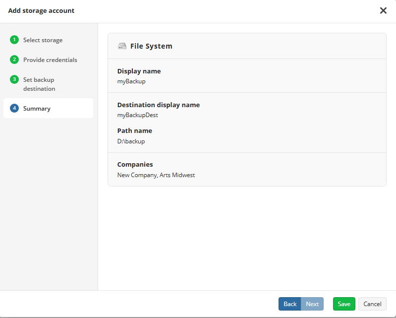 - Local File System Account: This storage account can only be added for the specific computer in Management Console or in the local Backup Agent instance. It is the best storage for external drives used on a single specific computer, allowing localized backup management without centralized access requirements.