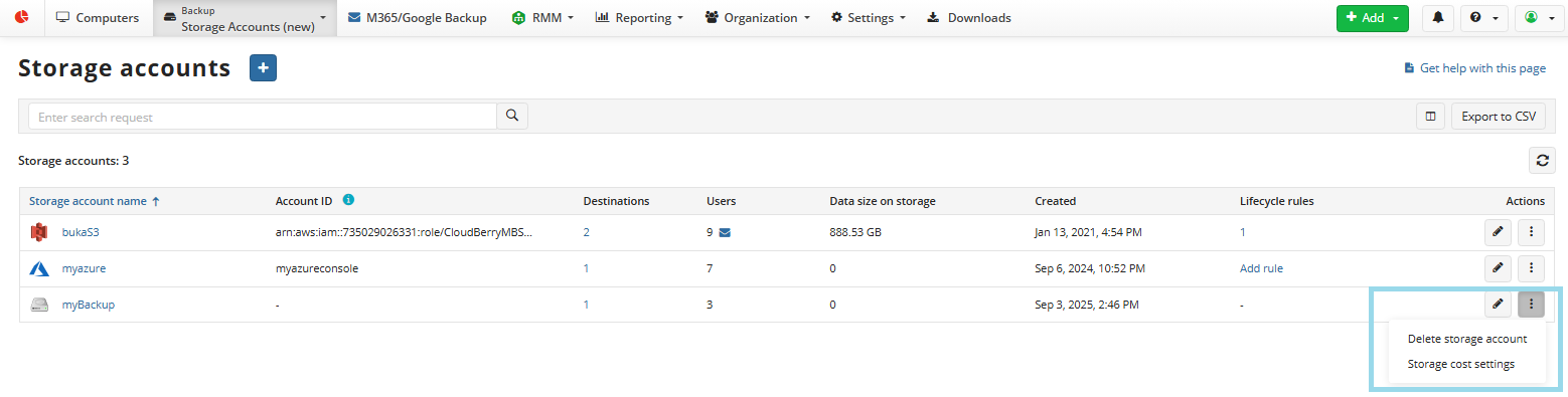 - On Storage select the Storage Accounts item if you use the legacy main menu, or open Backup > Storage Accounts page in the new main menu.