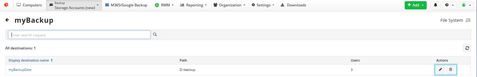 To manage backup destinations of the file system storage account, click on storage account name to open the backup destination view.