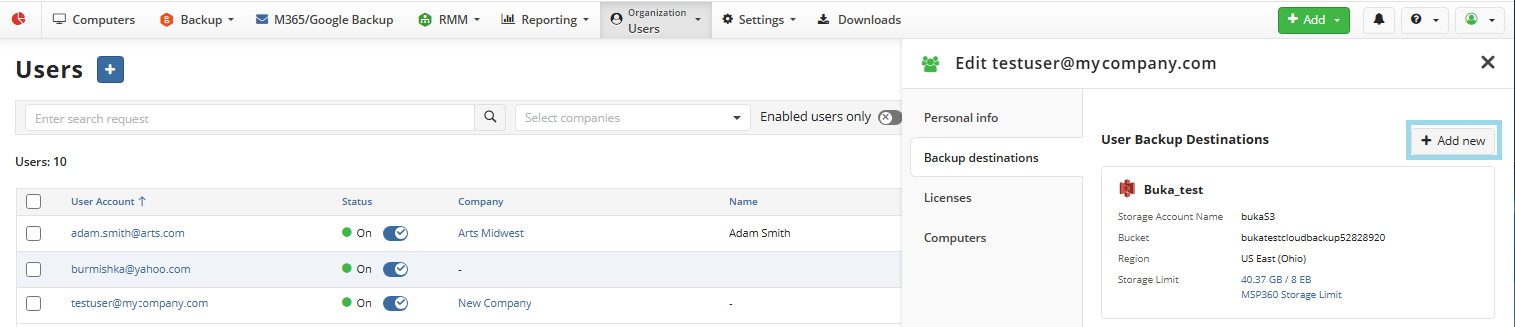 In case you need to override company storage destinations for a specific users, perform the following steps:
