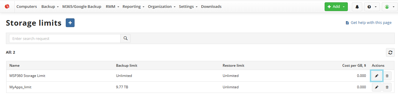 Storage limit can be configured by Provider or by Administrator with Storage limits permission. To open the list of storage limits, select the Storage Limits item in the Backup menu of the Management Console. The list of storage limits has a grid view.