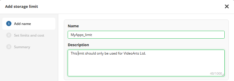 - In the Add name step, you can change the display name of the storage limit. In the Description field, you can change a description of the storage limit.