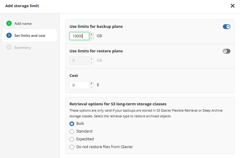 - In the Set limit and cost step, configure the storage limit settings: Use Backup Limit checkbox if you want to limit the total size of backups for this storage limit. If you want to keep the total size of backups unlimited for this storage limit, keep this check box deselected.