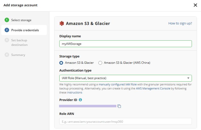 - On the Provide Credentials step, name the storage account, then select whether you need Amazon S3 & Glacier or Amazon S3 & Glacier (AWS China).