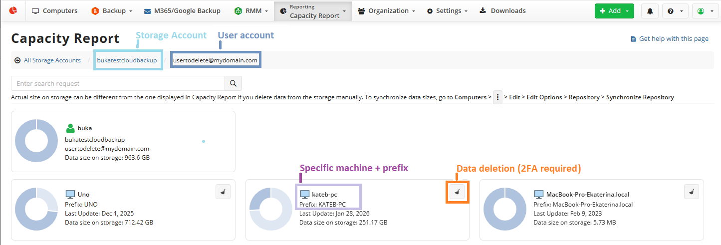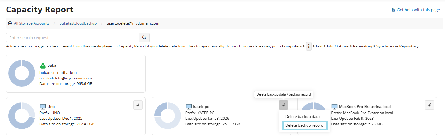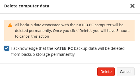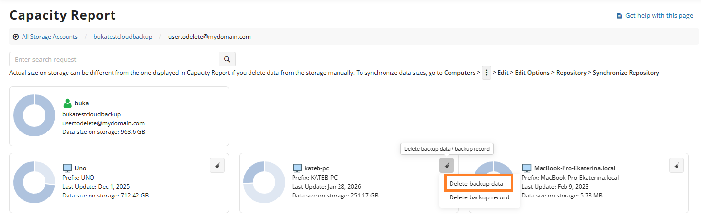 Data deletion may be necessary in various situations, such as decommissioning a computer or freeing up storage space in the cloud. When deleting computers from the Computers page or uninstalling the Backup Agent, the data might remain in its backup destination. This data can be deleted in the Management Console as described below or in the Backup Agent UI article. It's possible to check for unnecessary data using the Capacity report.