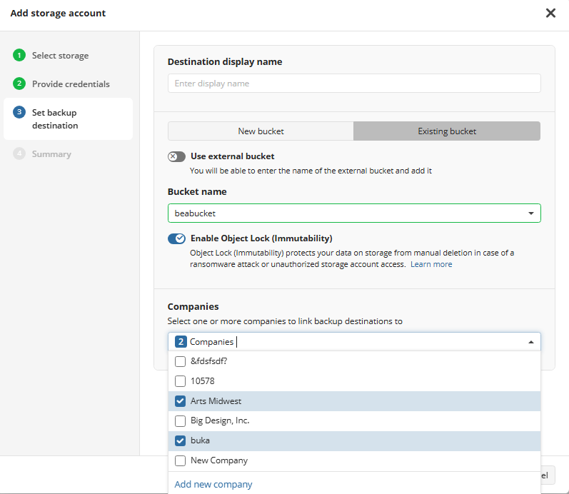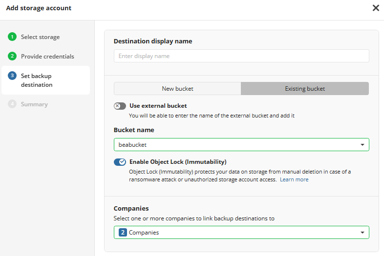 - Select the Existing bucket option to use the existing bucket, then select it in the drop-down list. Also you can select an external bucket you have access to. For the buckets with Object Lock turned on, you can enable Object Lock (Immutability)feature. Otherwise this functionality will be permanently disabled.