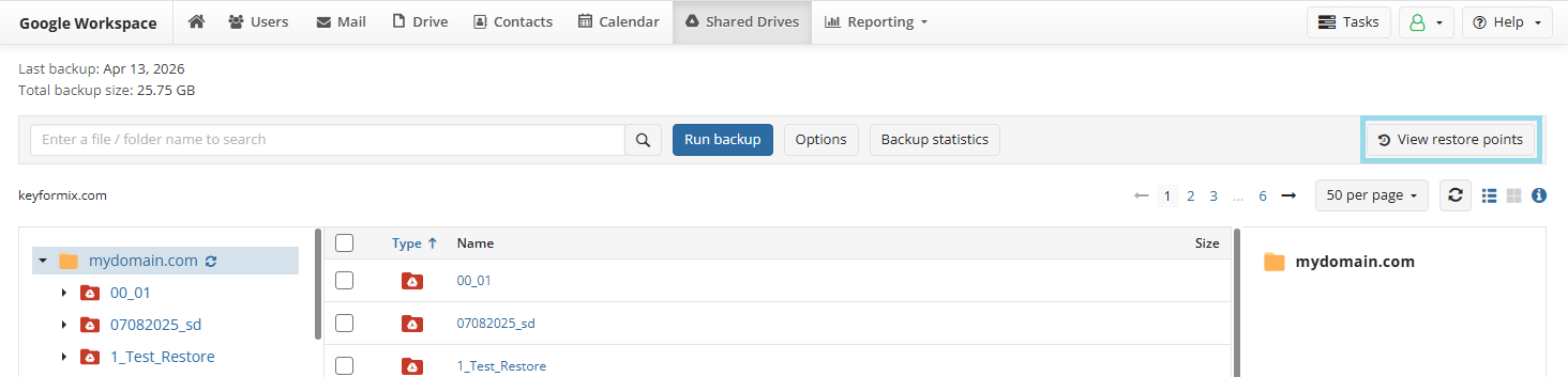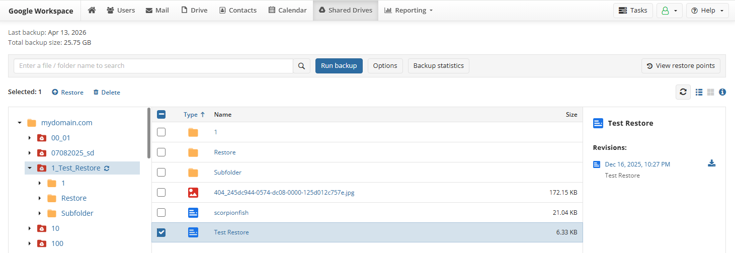 To restore Shared Drives objects (files and folders), select Shared Drives in the horizontal menu bar. Refer to the Prerequisites for Restore Operations chapter to avoid any issues.