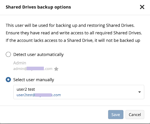 - By default, the system automatically detects and displays the administrator account used for Shared Drive backups. If you want to change this account, select Detect user manually, and then choose the required user.