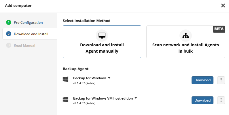 On this step you can select theinstallation method. You can perform downloading and installation manually with Download and install manually or use beta version of Discover and Deploy tool with Scan network and install agents on bulk.