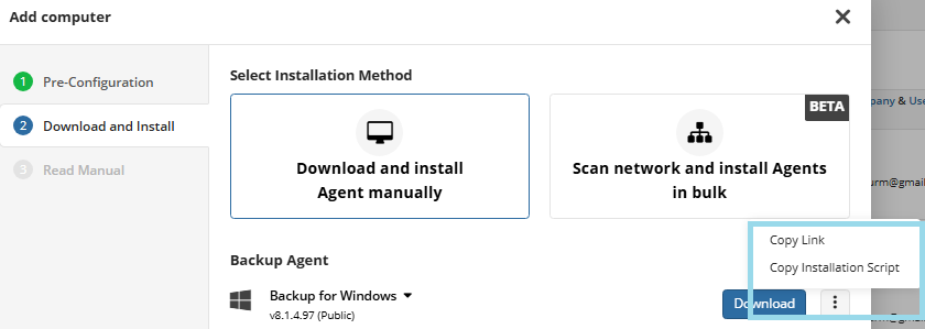 You can copy the installation script to execute it on the added computer or copy the link to download. To perform these operations use the actions next to the Download button.