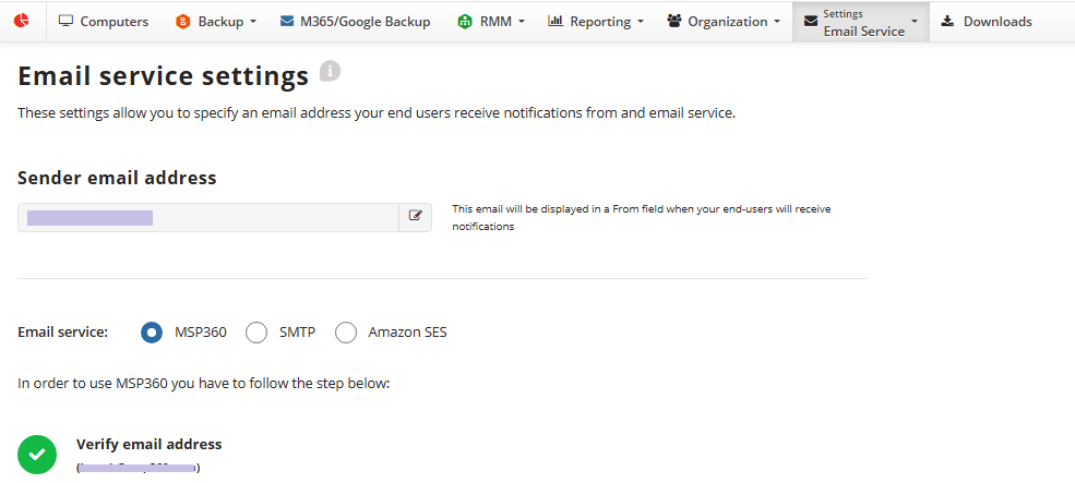 In case these default settings do not match with your requirements, you need to configure the Email Service. In Management Console, navigate to Settings > Email Service to specify an email address your end users receive notifications from and select the email service. This step is mandatory.