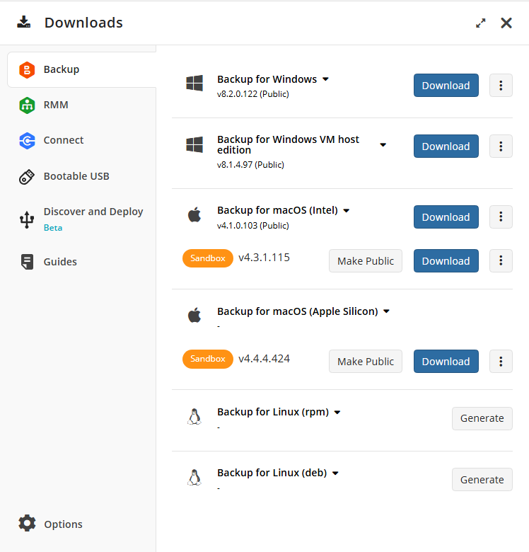 - On Computers: general options, license options, backup and restore plans for the computer, and backup storage browser (beta version). You also can switch to the RMM > Computers side panel and start remote connection to the computer using Connect.