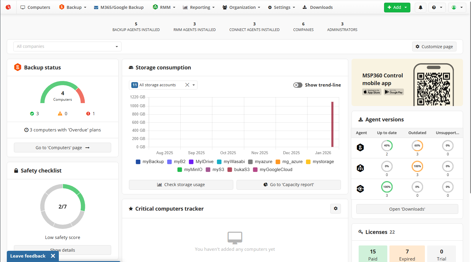 New + Add control help you add a new company, computer, domain to back up, or purchase a new license or credits.