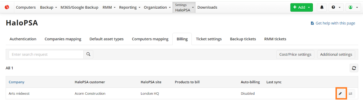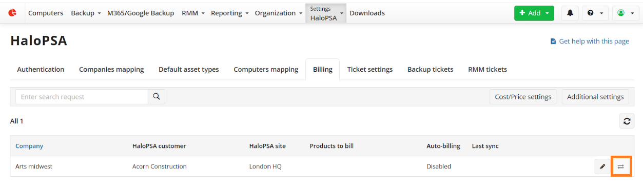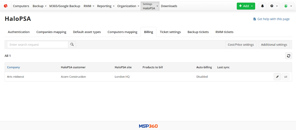 The integration with HaloPSA allows you to sync Managed Backup Service billing statistics with HaloPSA. Starting with Management Console version 9.2, you can include the number and cost of activated licenses in the billing data sent to HaloPSA.