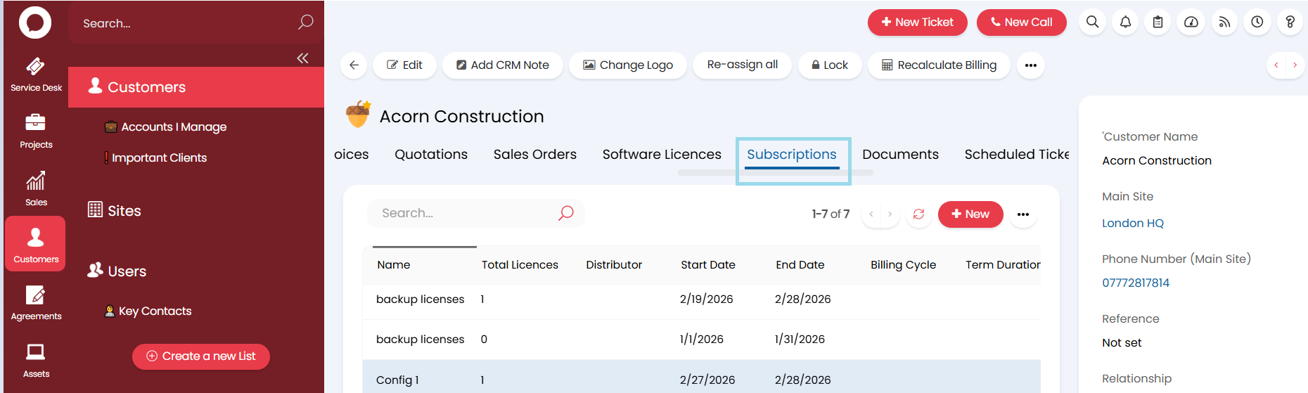 Select the Subscriptions tab to open customer subscriptions.