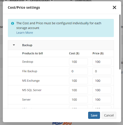 - Average Cost and Price for all selected products to bill. This option is not available if the storage accounts and licenses are selected in one configuration. It is recommended to create different configurations for licenses and storage accounts in case you need this option.