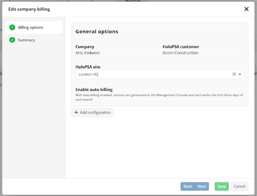 - The Edit company billing wizard starts. Select HaloPSA site.