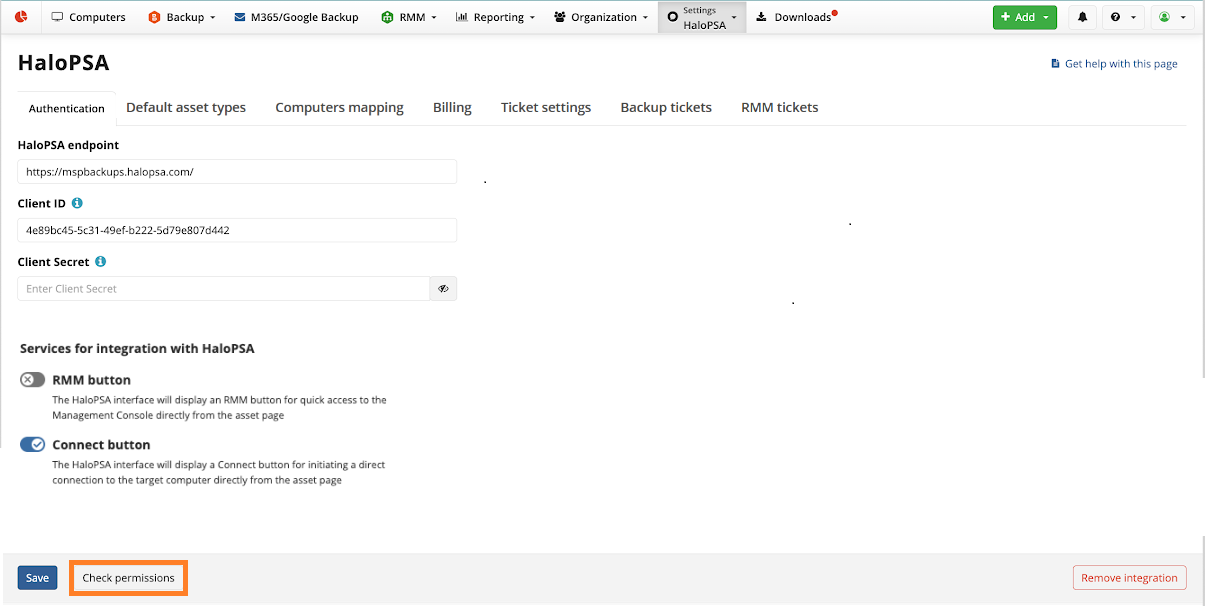 If the permissions of the account used to manage integration in HaloPSA are not sufficient to delete the Connect and RMM button and associated custom fields during integration removal, these buttons and fields remain in the HaloPSA console. Administrative privileges are required to perform this operation. It can be performed manually in the HaloPSA console.