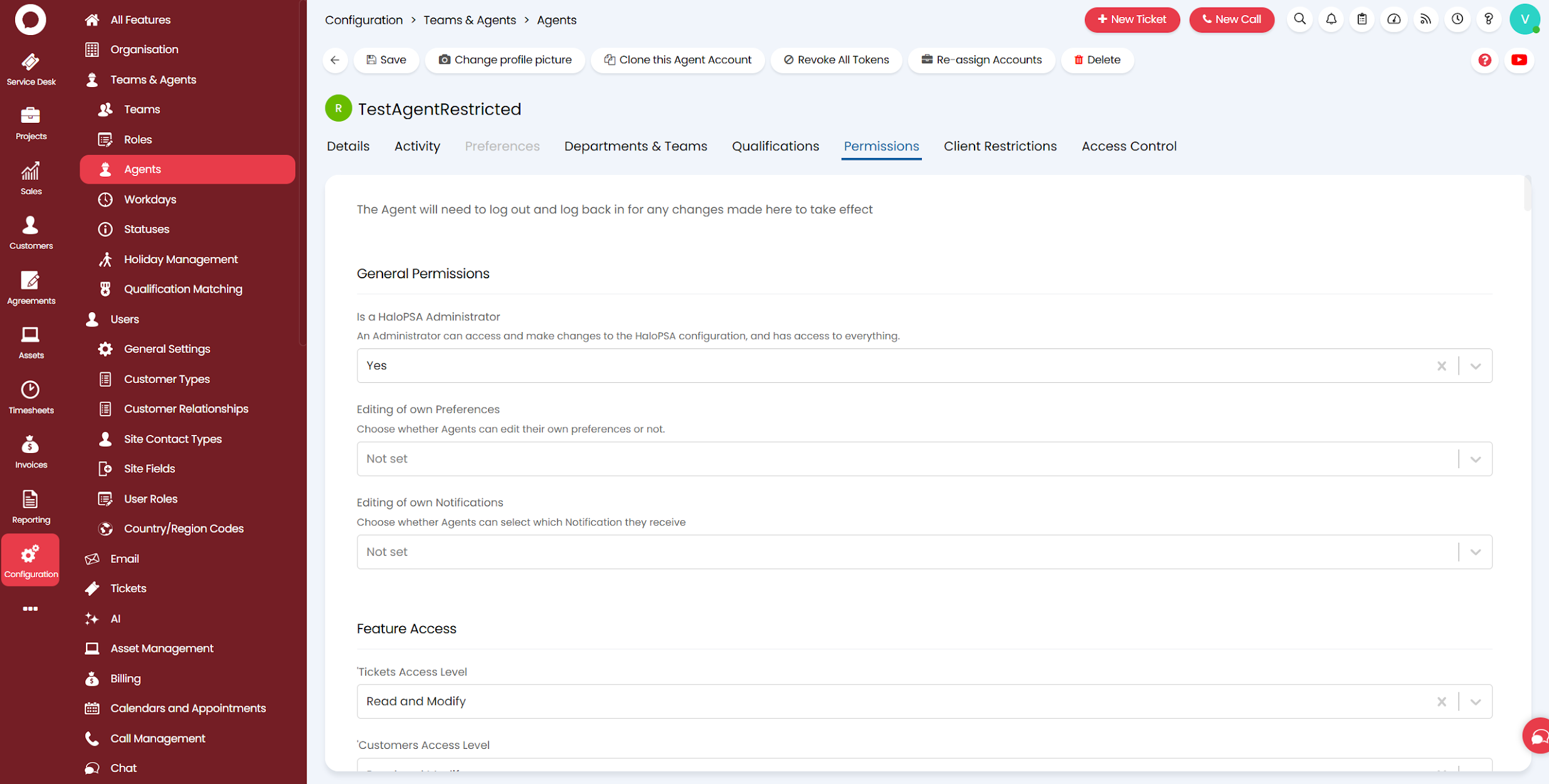 - On the Permissions tab, select Yes for Is a HaloPSA Administrator** and Read and Write for Tickets Access Level.
