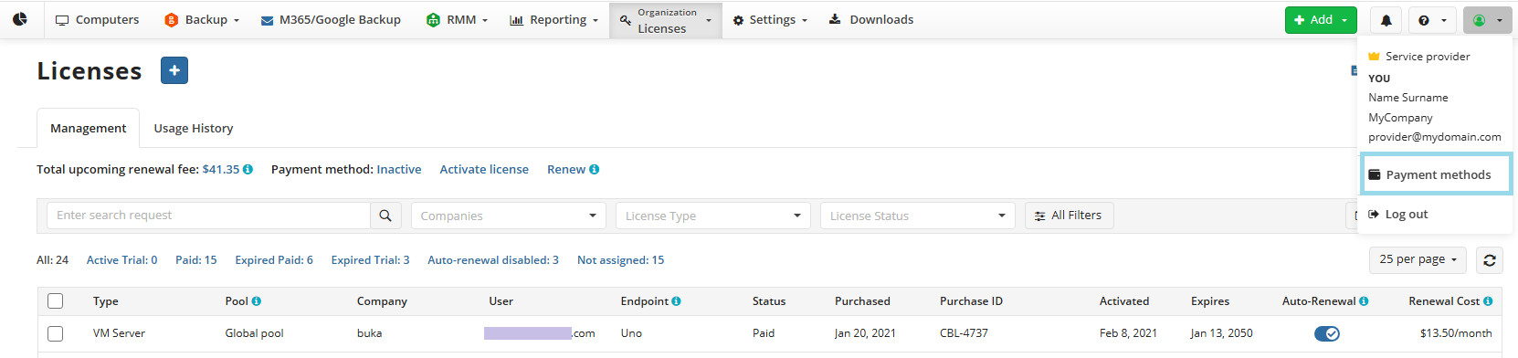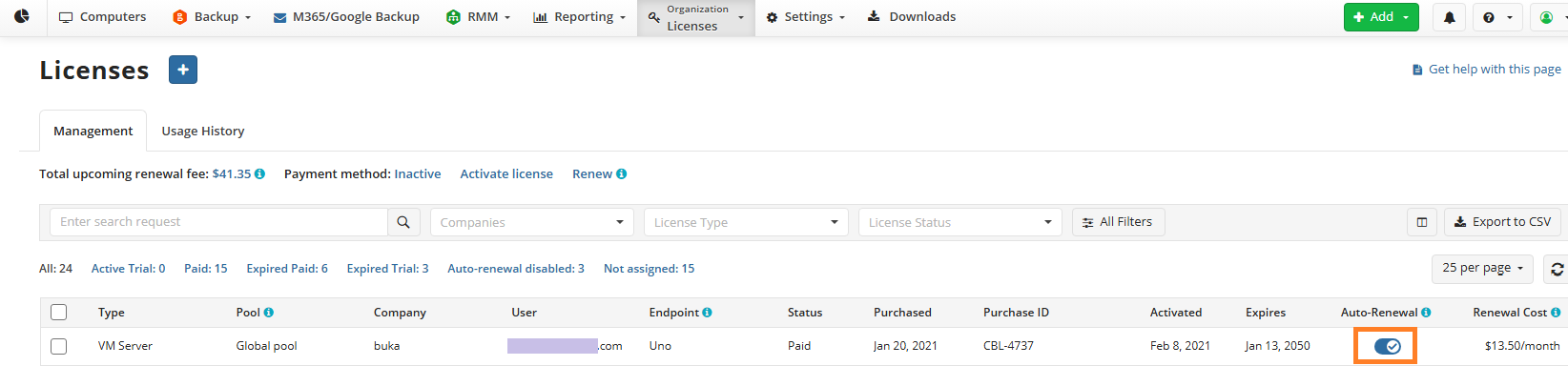 - For each license you wish to deactivate renewal, locate the Auto-Renewal toggle on the right side.