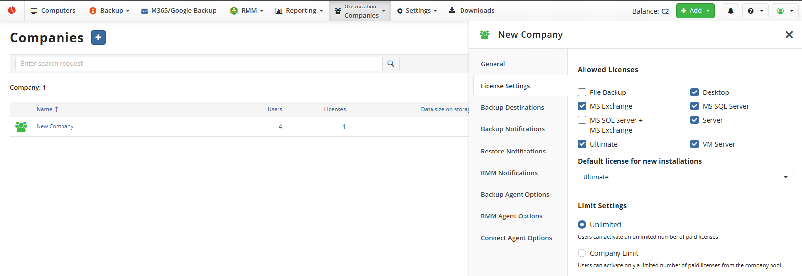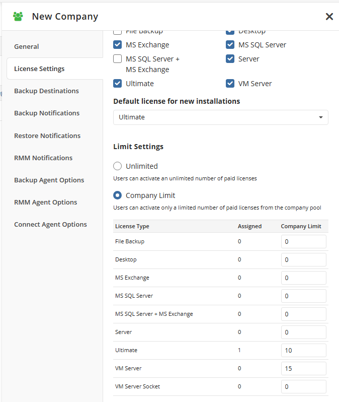 - In the Company Limit column, set the required limits for desired license types. As you finish, click Save.