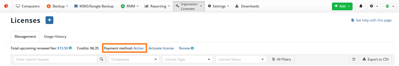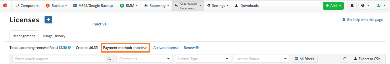 If your payment method status is Inactive under Organization > Licenses, you need to configure your payment method.