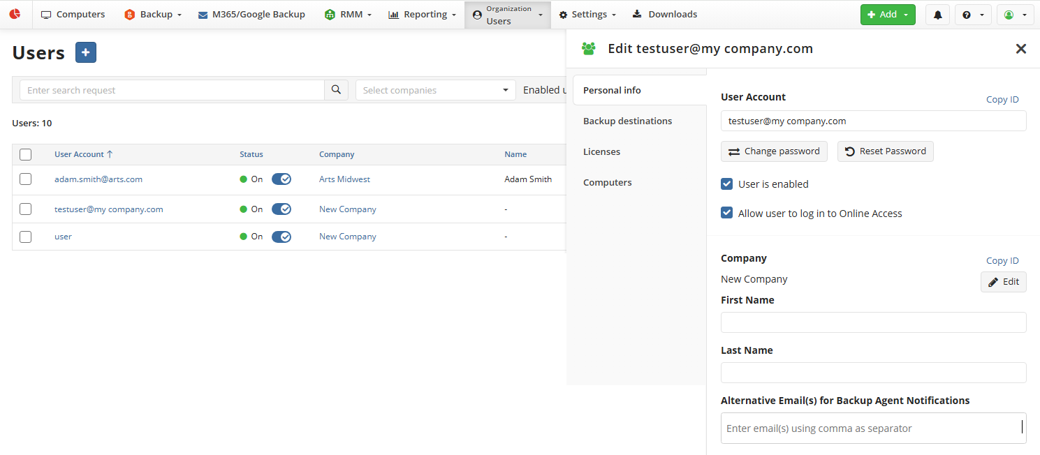 - You can change the user password with Change Password or send the reset password link to the user to delegate password changing.