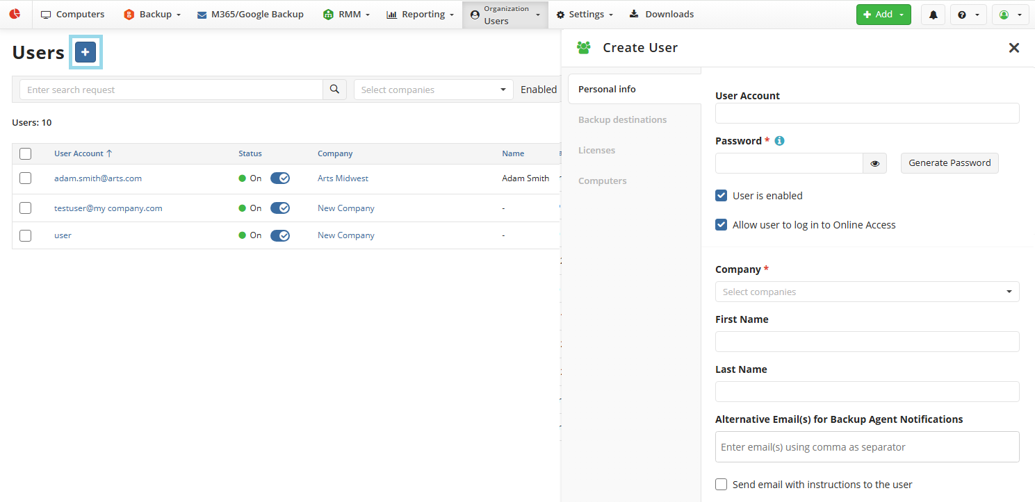Managed Backup is equipped with an efficient tool to manage your users. To manage users, the Organization > Users and Organization > Create/Edit Users permissions should be granted as the administrator permission on Organization > Administrators.