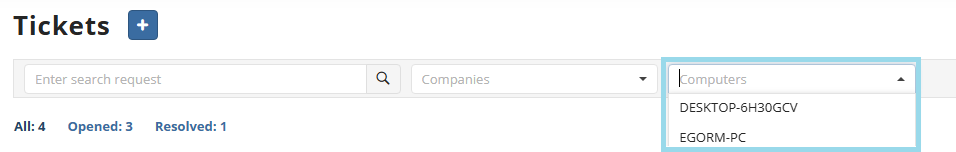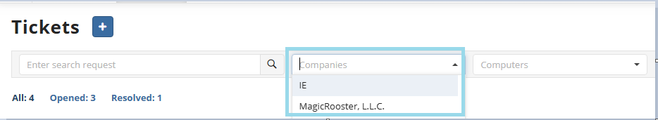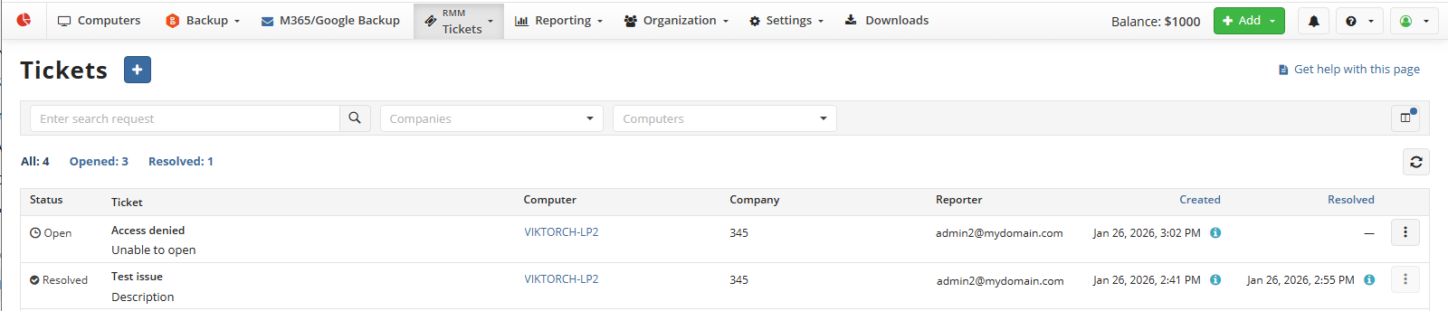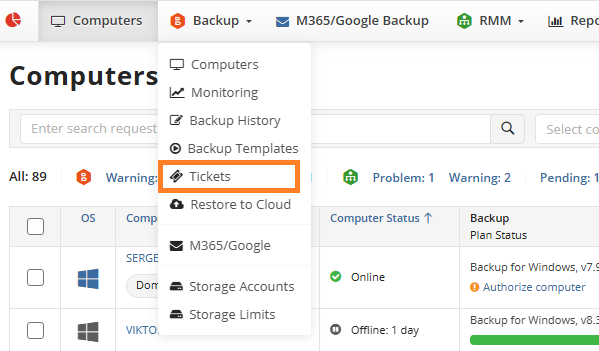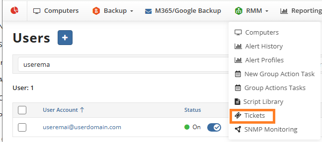 - Navigate to Backup > Tickets, or RMM > Tickets in the main menu.