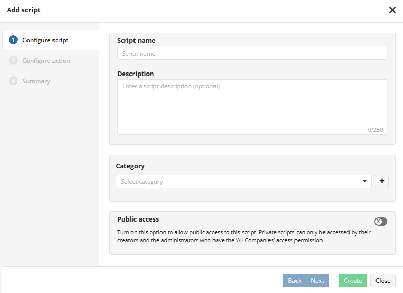 - On the Configure script step, name the script, provide a description, specify access level, and set the script category. Click Next.
