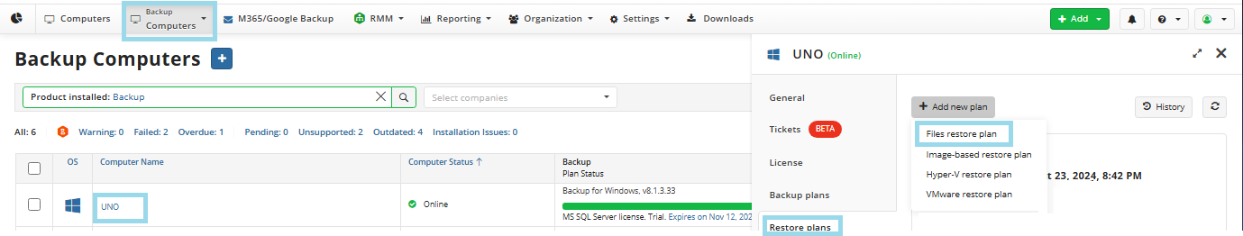 - On Computers select Remote Management if you use legacy main menu, or open Backup > Computers page in the new main menu.