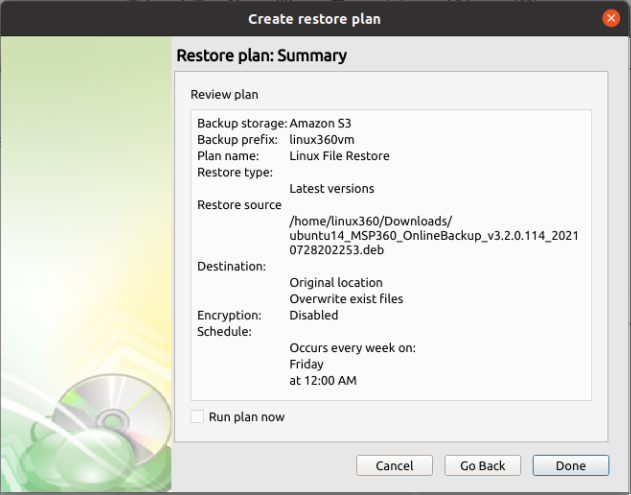 - The final step in the wizard will provide you with a summary of all previously selected options. If the plan was scheduled, you can opt to run it immediately by checking the “Run plan now” box and clicking “Done”. Otherwise, the plan will be set to run at the next scheduled time.