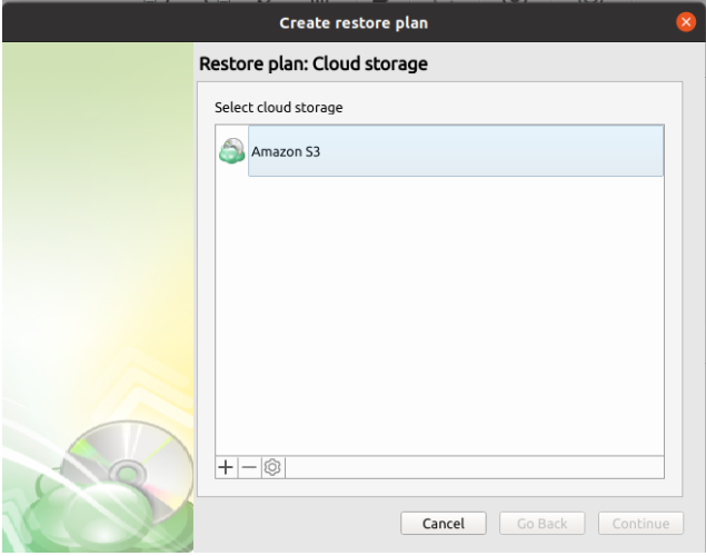 - The next step will prompt you to select the source storage for the restore. If the desired storage is not in the list, you can click on the “plus” to add it.