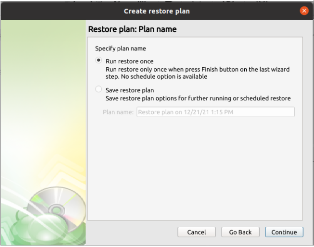 - Run restore once will execute the restore immediately upon completing the wizard. There is no option to schedule this type of restore.
