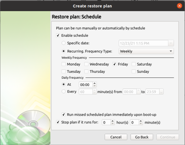 - If “Save restore plan” was selected at the start of the wizard then the next step is to set the schedule for the restore plan. Otherwise this step will be omitted.