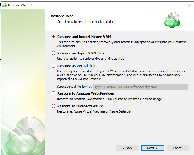 Restore and import Hyper-V machine: Selecting this option restores the virtual machine configuration as well as the virtual disks as files. Use this option to have the VM automatically imported to the hypervisor.