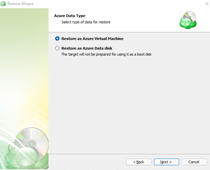 - Restore to Microsoft Azure: This will restore the VM directly to Azure as either an Azure Virtual Machine or Azure Data disk.