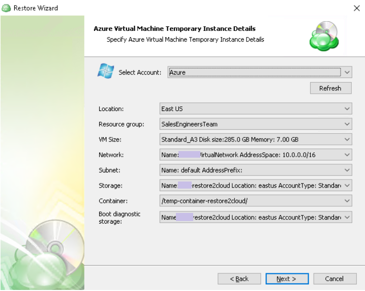 If Restore as Azure Virtual Machine was selected: The next step allows you to select the appropriate Azure account from the upper dropdown box, and specify the configuration below. These options may vary depending on the type of instance selected in the previous step.