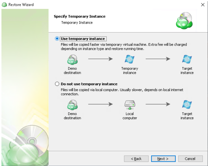 Use a temporary instance for faster cloud-to-cloud restores; avoid it to reduce cloud compute costs at the expense of speed